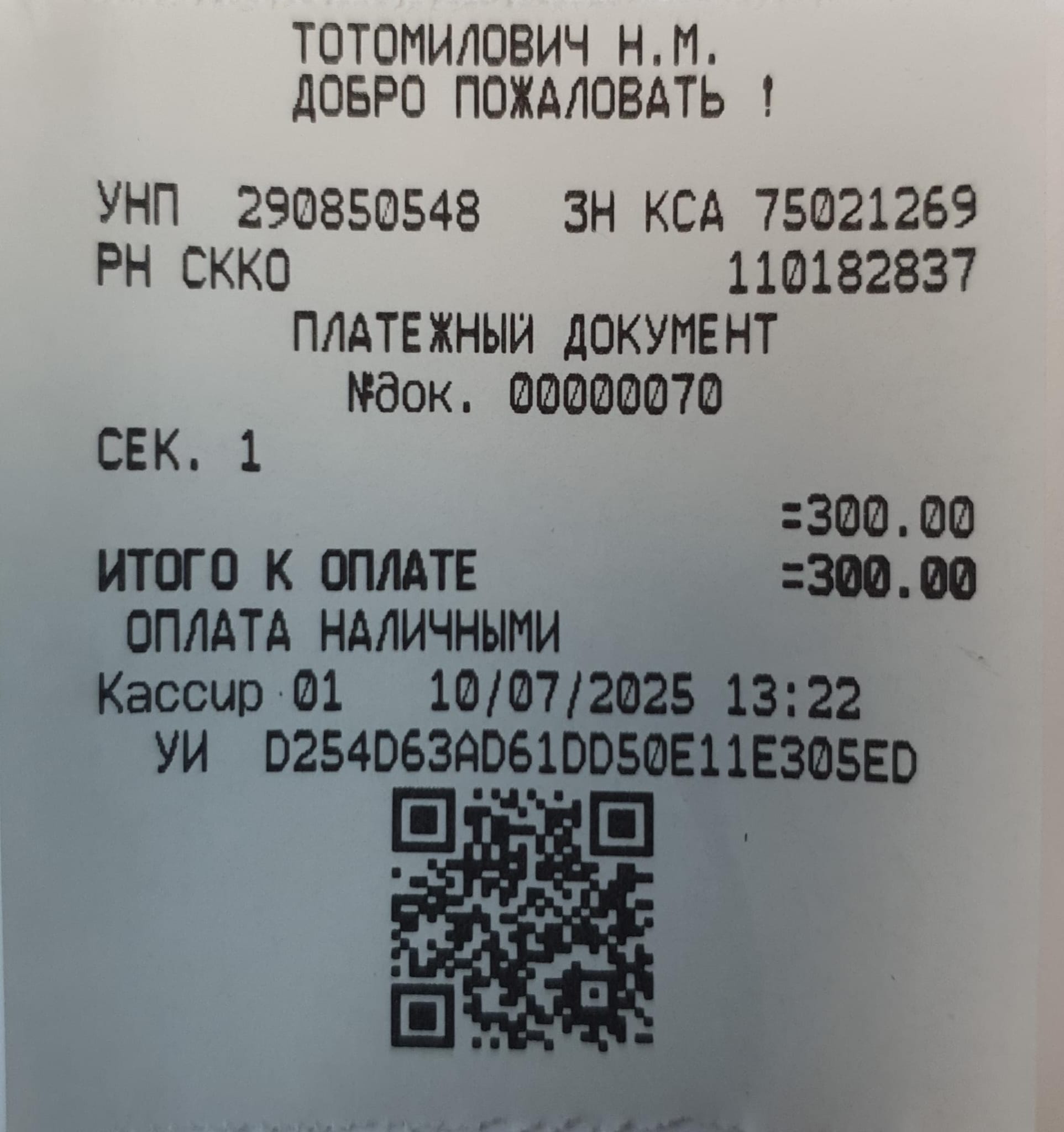 При приёме денежных средств клиенту выдаётся кассовый чек. Образец чека: